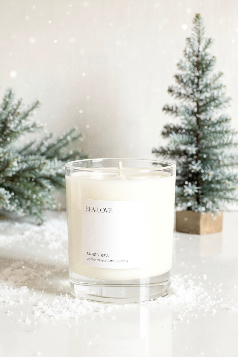 Our Après Sea candle is a beloved seasonal favorite, evoking the warmth and comfort that follows a festive day by the shore. This luscious blend combines spiced cranberries, apple marmalade, and clove, softly grounded by hints of warm myrrh — a cozy, sophisticated fragrance that lingers like the perfect coastal evening.